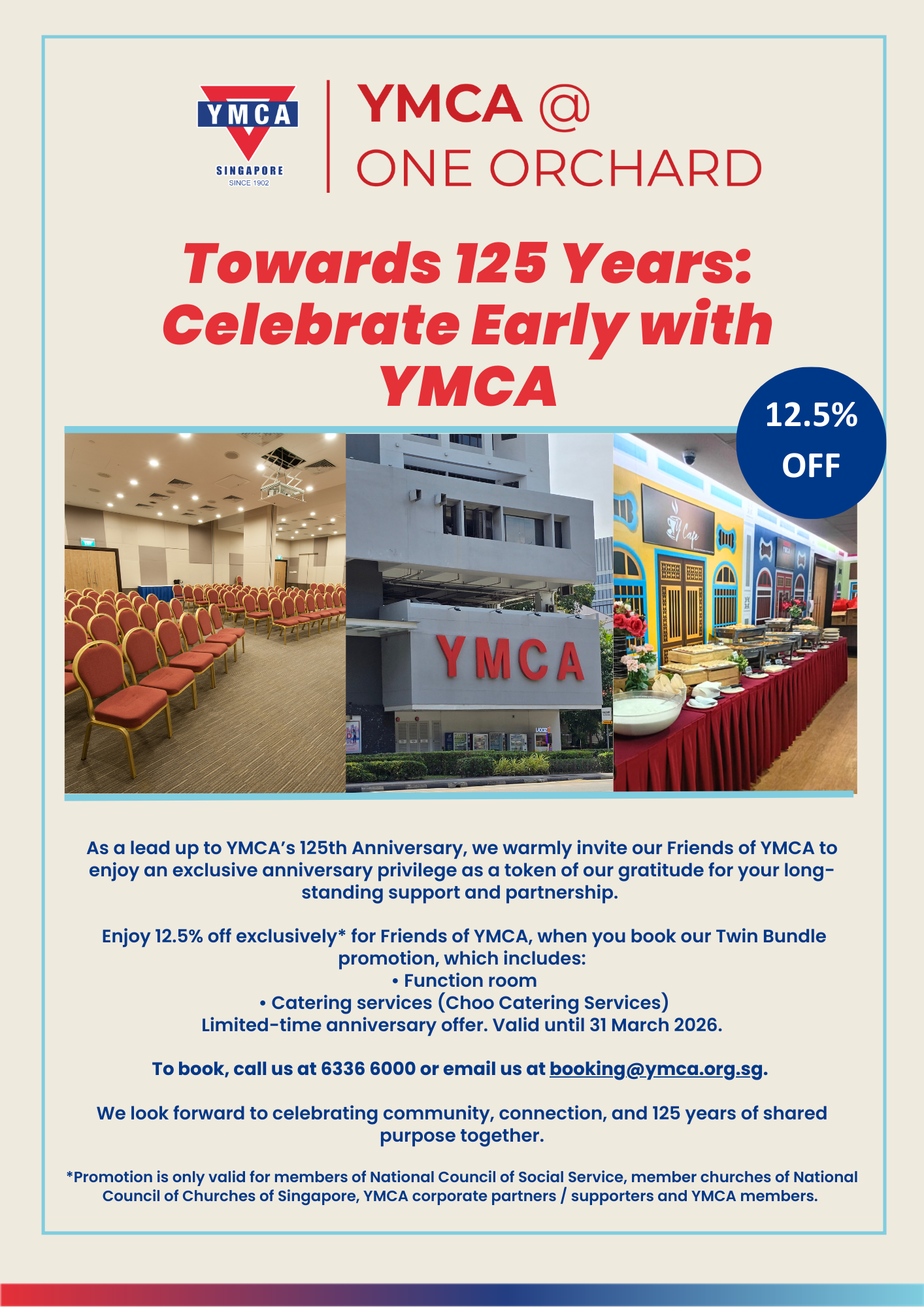 YMCA is pleased to extend a 12.5%-off special offer to NCCS member churches as a lead-up to YMCA’s 125th anniversary. The special Twin Bundle promotion is valid till 31 March 2026. All member churches of NCCS will receive a special 12.5%-off when they book YMCA’s function room and Choo Catering Services, together. See LINK